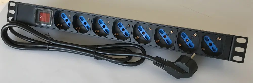 1u 19" Power Distribution Unit with 8 universal sockets + light switch.