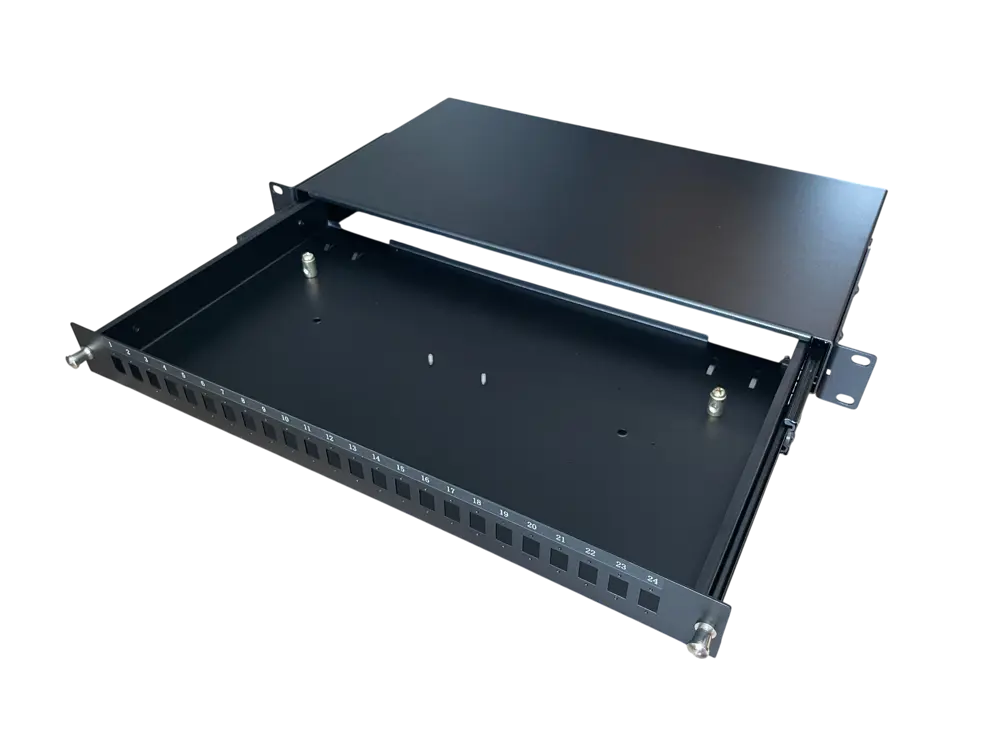 Cassetto per fibra ottica con 24 porte per adattatori SC Simplex e LC Duplex.